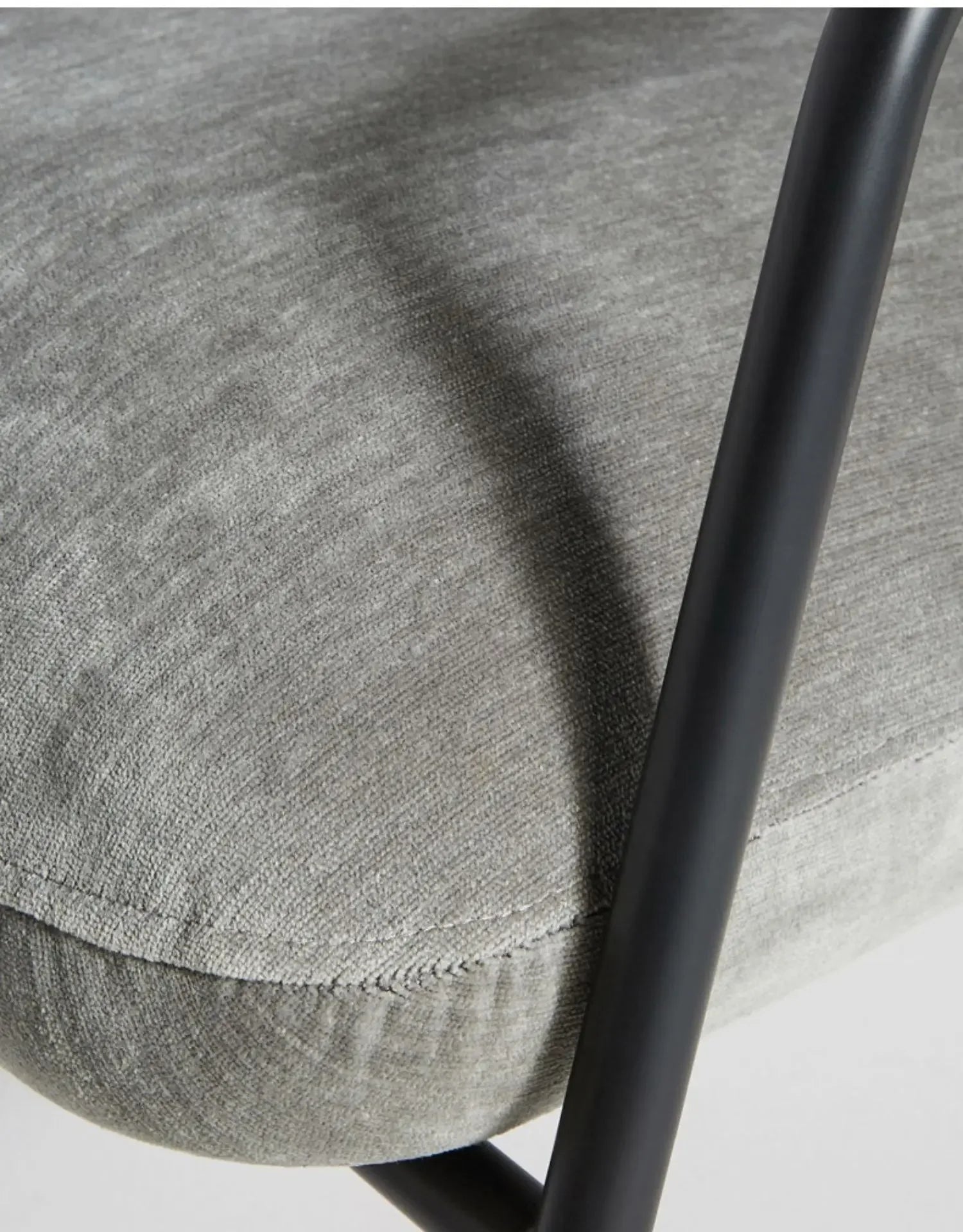 This minimalist industrial armchair combines sleek modern lines with understated elegance. Designed with a black metal frame, cushioned seat, and a cylindrical headrest, it offers a refined yet casual seating experience. The soft fabric upholstery and clean design make it suitable for both modern and industrial interiors. Lightweight yet durable, it’s easy to move and style in living rooms, home offices, or bedrooms. Its versatile design blends comfort with style, making it a functional decor piece that enhances your interior aesthetic. Pair it with a side table for a perfect relaxation spot.